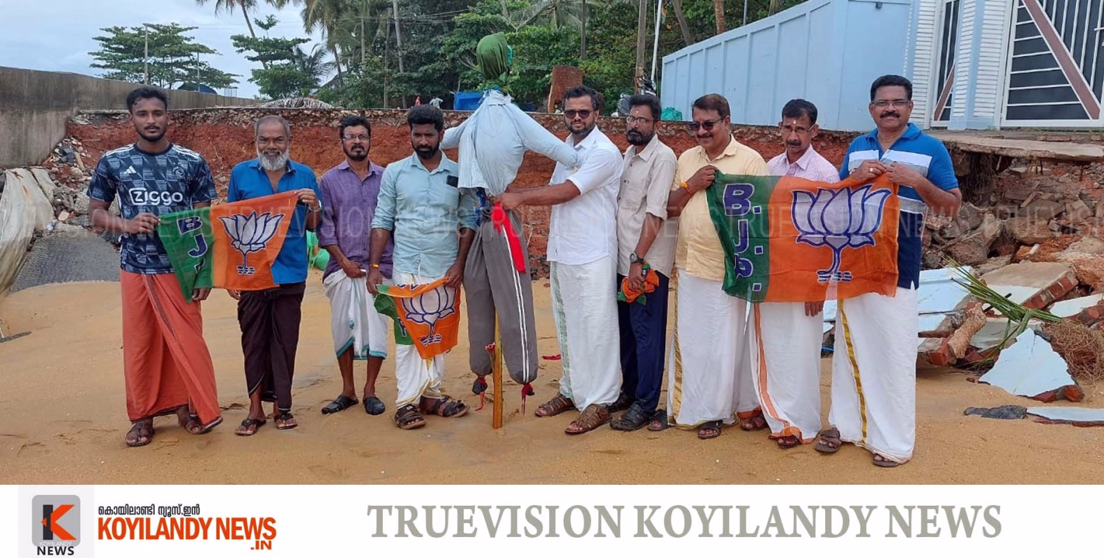 #kappad |കാപ്പാട് തീരദേശ റോഡിൻ്റെ ശോചനീയാവസ്ഥ; മന്ത്രിയുടെ നോക്കുകുത്തി സ്ഥാപിച്ച് ബിജെപി പ്രതിഷേധം